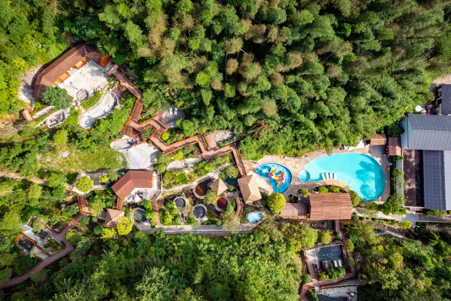 原生态青嶂山中的天然温泉,室外温泉区拥有将近20个汤池,泉水温度高达50多度,在这里可以体验在山林美景中泡泉的松弛。