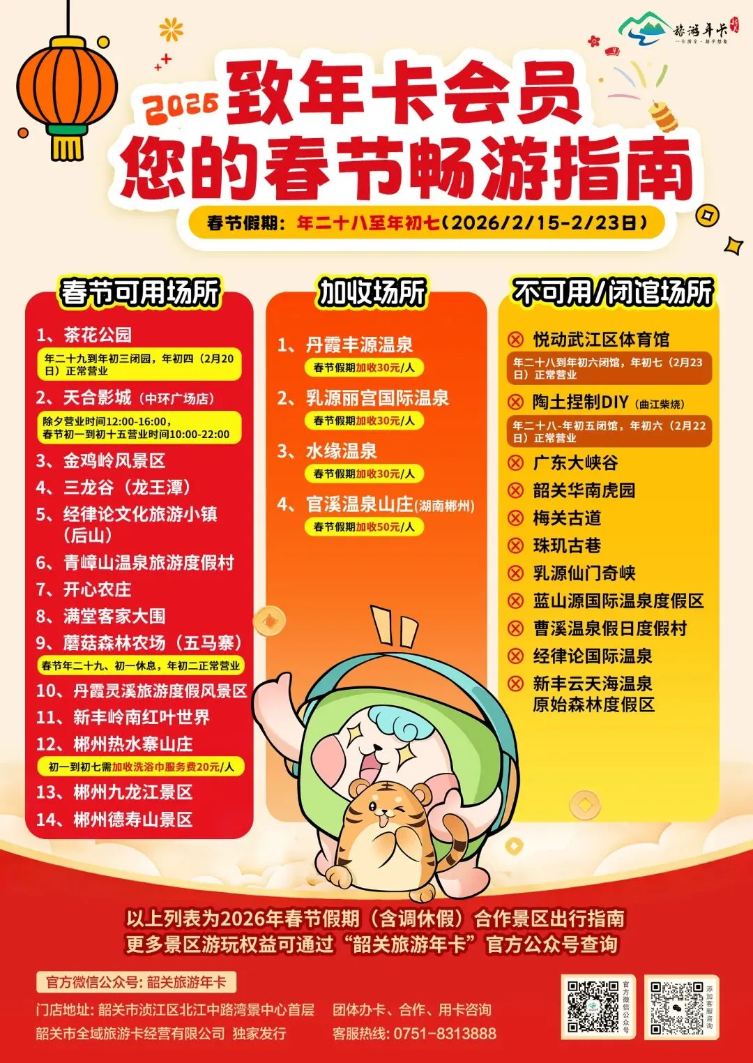 🎉韶关旅游年卡使用规则:全年免费游玩5次,初一至初七加收洗浴巾服务费20元/人。