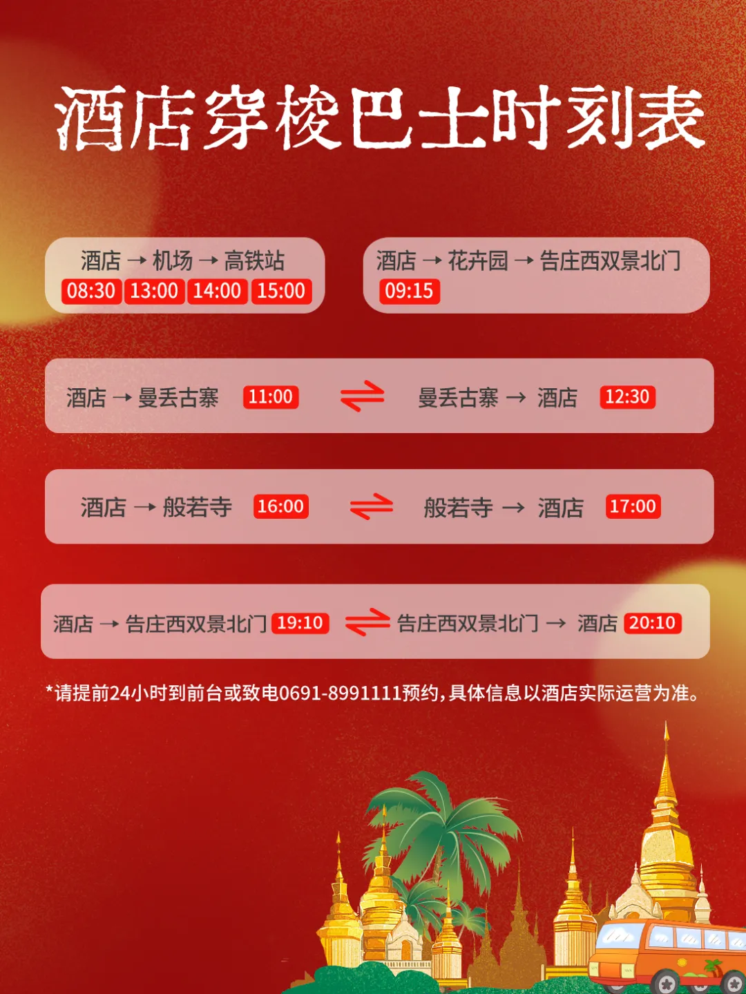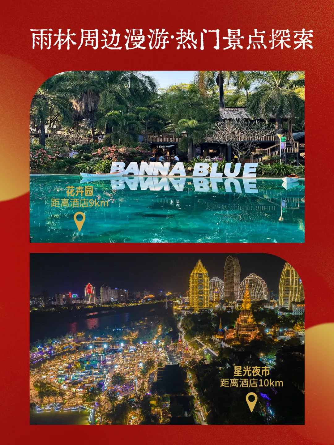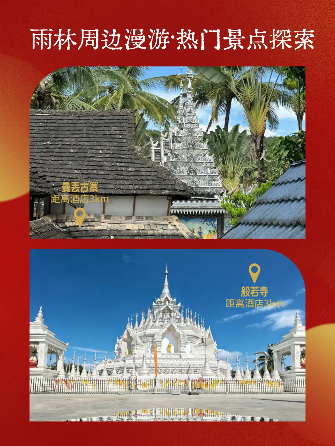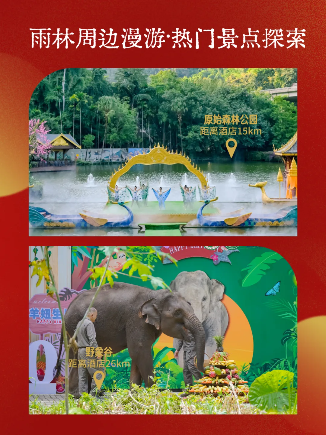 🌿【周边漫游 · 雨林古寨秘境】从酒店轻松出发,探索多样版纳💐走入热带花卉园与原始森林公园,沉浸绿意🍍探访曼丢古寨,感受原生态傣家生活🐘前往般若寺静心祈福,或去野象谷邂逅奇缘🚌酒店免费穿梭巴士预约