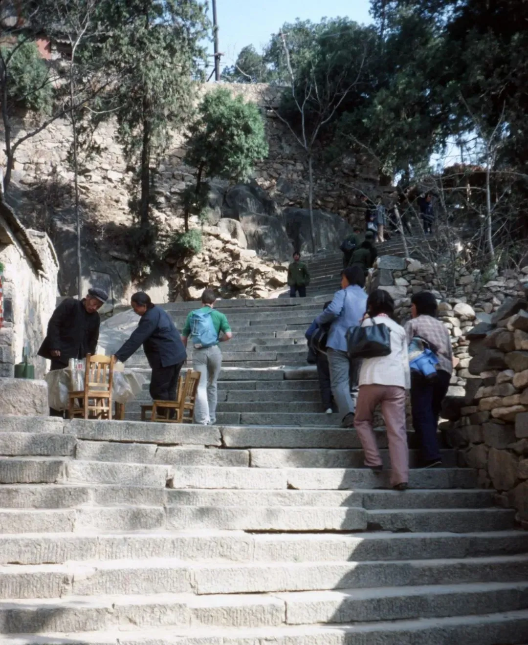 图里这一溜石阶就是泰山的味道,背包简陋,小摊的热茶用铝壶冒着白气,几个叔叔抬着小凳子边吆喝边挪,我第一次上山穿着塑料底球鞋,台阶缝里塞着青苔,脚一滑心一下吊起来。
