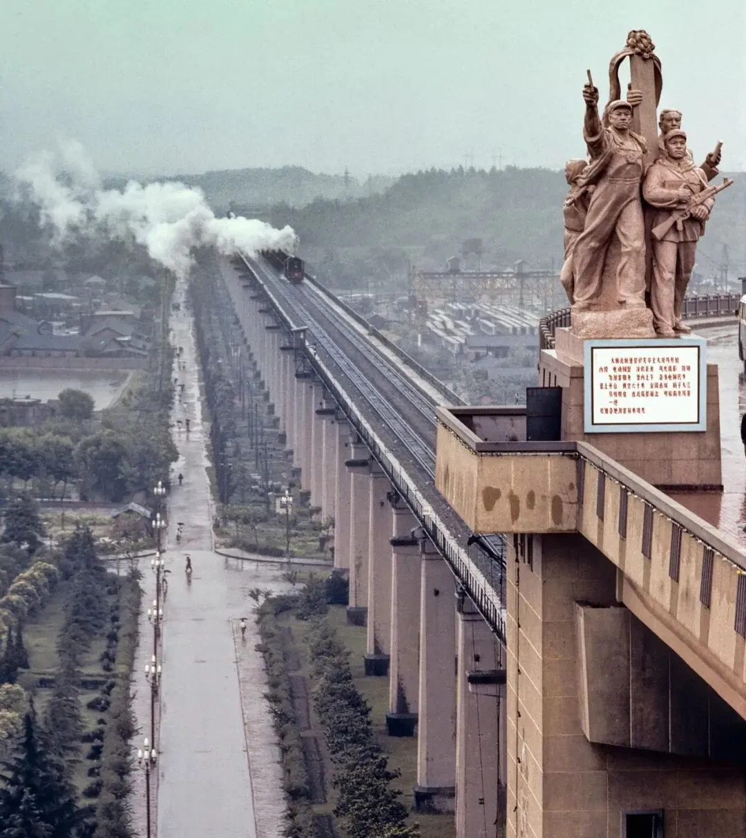 这个高台上的雕塑正对着铁轨,火车冒着白烟哐当而来,桥身笔直伸进天光里,爸爸说第一次站在桥头堡看车从脚下轰过去,胸口像被擂了一拳,那气势到现在都难得见。