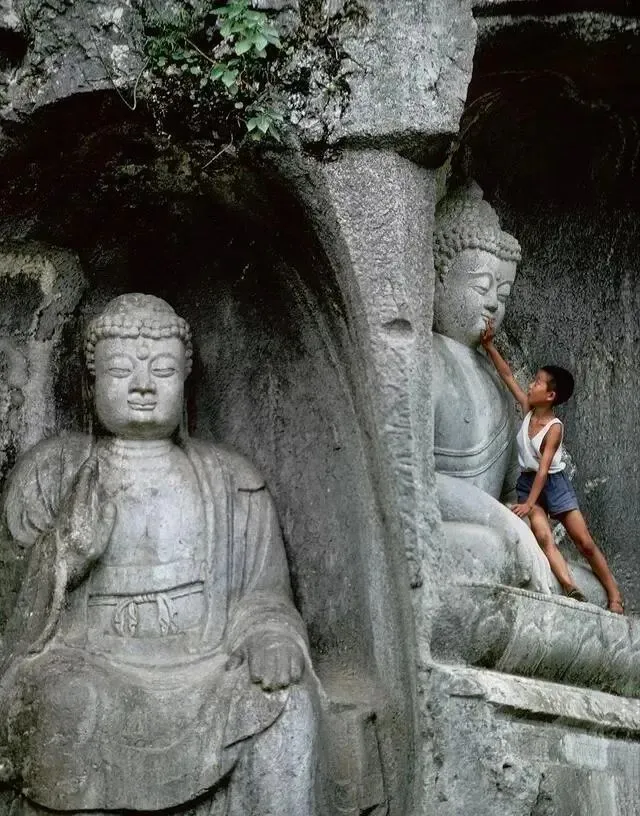 这块山壁叫飞来峰,小石窟里坐着佛像,一个小孩踮脚去摸鼻尖,石面被手掌摸得发亮,妈妈笑我淘气,说你小时候也这么蹭上去,裤腿上全是白石粉,现在再去可看不见这阵仗了。