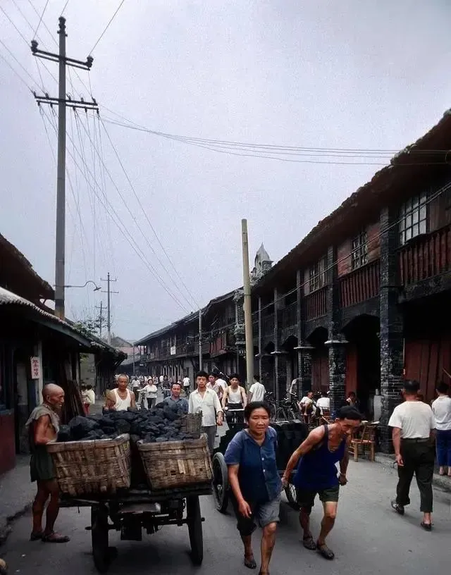 这个木车拉的是煤块和煤球,窄街两旁是木楼,汗水把衬衣浸成了深色,游客让路、孩子追着看热闹,那个年代做饭取暖离不开煤,出门在外的烟火气就靠这些家伙撑着。
