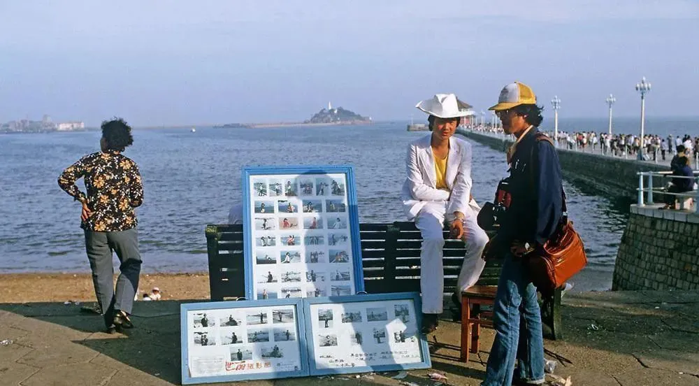 这几块立起来的相册叫影楼样片,摄影师肩上斜挎皮包,拿口号招呼游客就在海风里定格姿势,栈桥尽头人来人往,若那时人人有手机,这门手艺可就真要凉了。