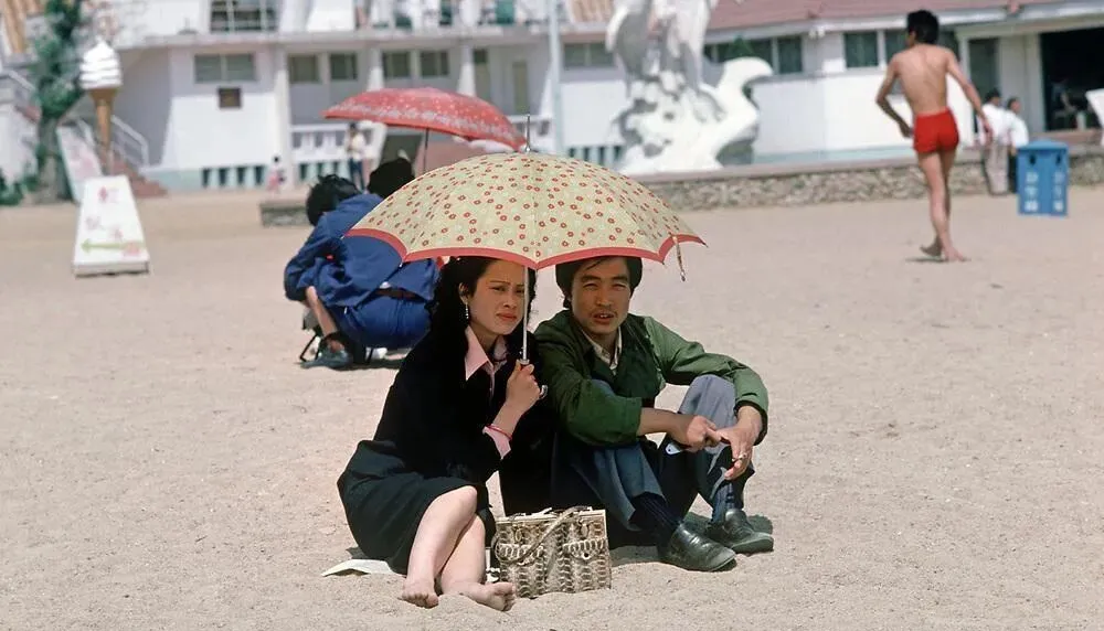 图里的伞面是淡红碎花,夫妇俩挤在伞影下,男士穿着绿色军装,女士黑色裙摆压在沙子上,篮子里露出几根面包袋,太阳很辣,可他们的脸上有种出门见世面的光。