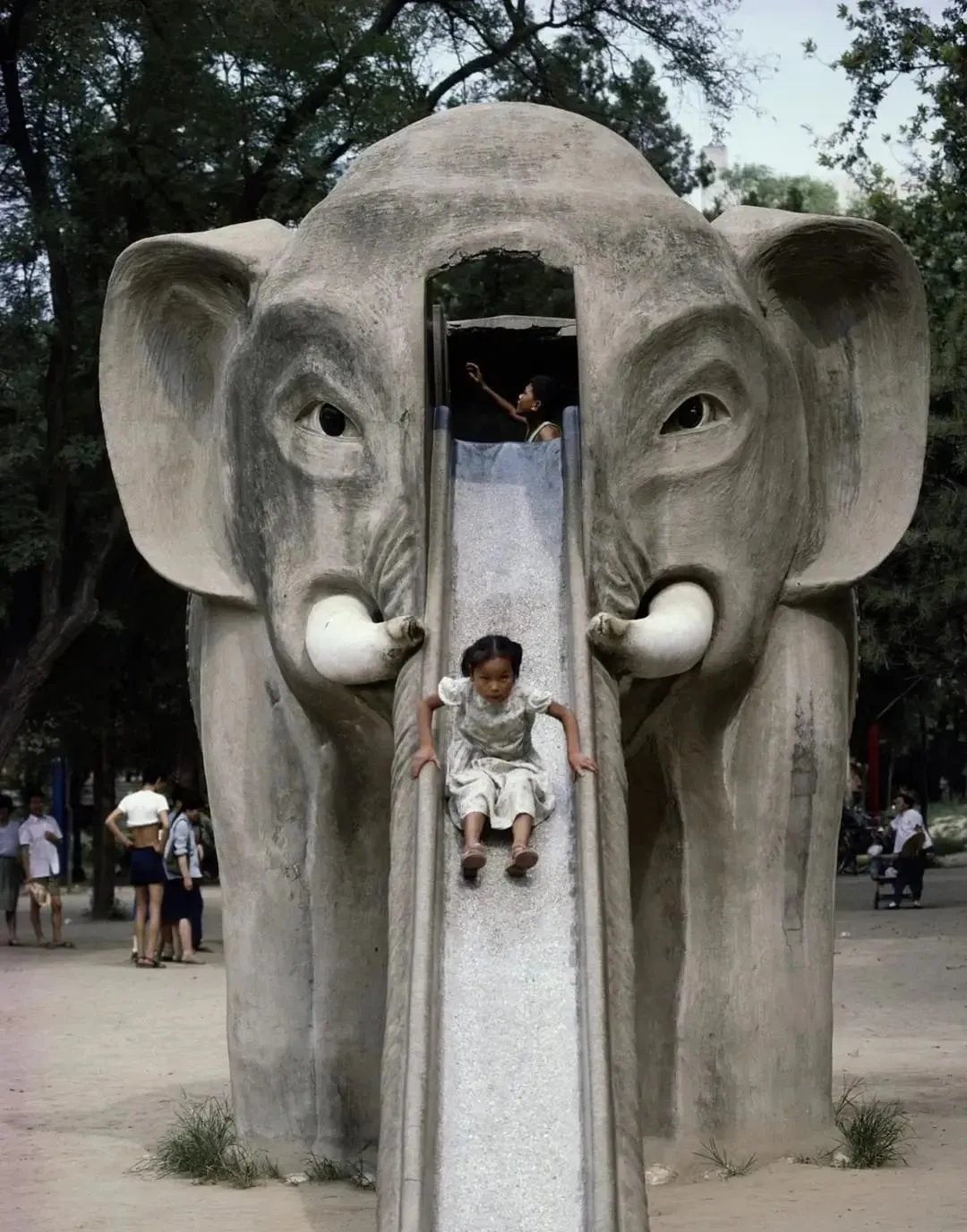 这个水泥家伙是大象滑梯,象鼻就是溜槽,粗糙的水磨石夹着石子点点,手一扶就生凉,小时候我从上面咻一下滑下去,屁股一颠差点把口袋里五分硬币给震出来。