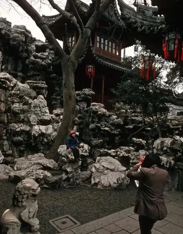 图中这处假山叠石最会骗小孩,塞牙缝似的一坐就显得灵巧,摄影师半蹲着抬相机,红灯笼从檐口垂下来,咔嚓一声,家里相册又多了一张古色古香的合影。