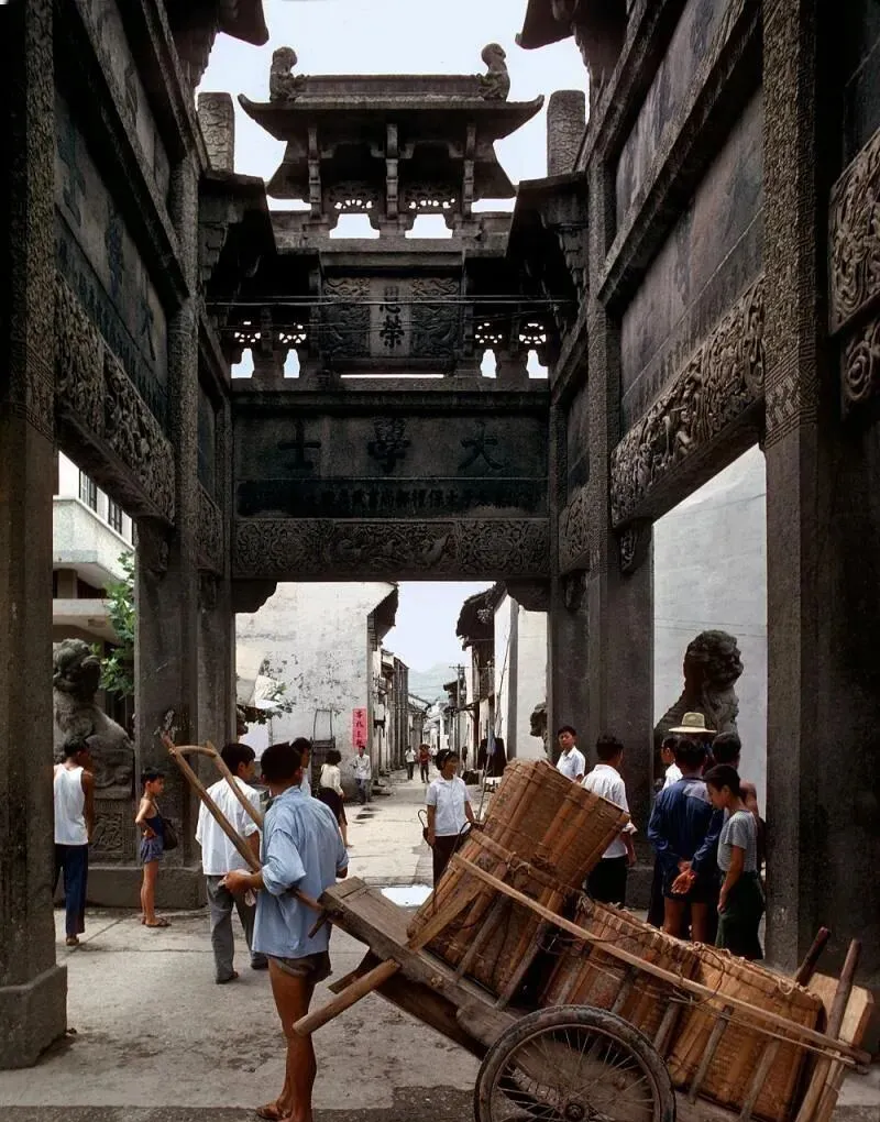 这座青石牌坊刻满纹样,牌坊下推着的木板车用竹箩装货,轮子吱呀吱呀地叫,游客靠墙歇着看热闹,石头的冷意往腿上蹿,站久了才舍得挪一步。