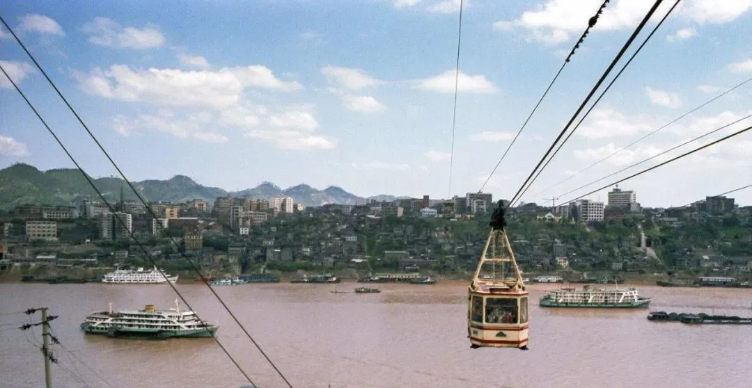 这厢房一样的小箱子就是缆车厢,跨江而过时下面是黄滚滚的江水,城对面起起伏伏全是房子,风把车厢吹得轻轻一摆,心里咯噔一下又忍不住往窗外探头看。