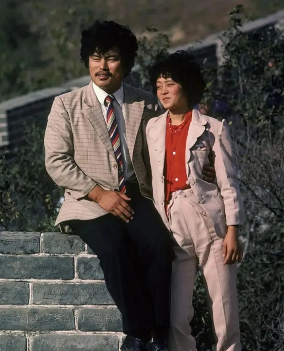 这对烫着发的夫妻在城砖上坐着,西装配皮鞋,领带压得直直的,笑容里是“终于来过”的满足,城砖上刻着密密麻麻的名字,像一墙自带的留言板。