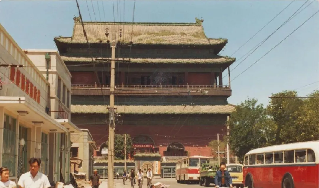 这个大屋顶是北京鼓楼,前面停着红白相间的公共汽车,街口电线杆子一排排立着,太阳一晒瓦当泛起亮光,老北京的味儿,大概就挂在这片阴影与阳光的交界里。