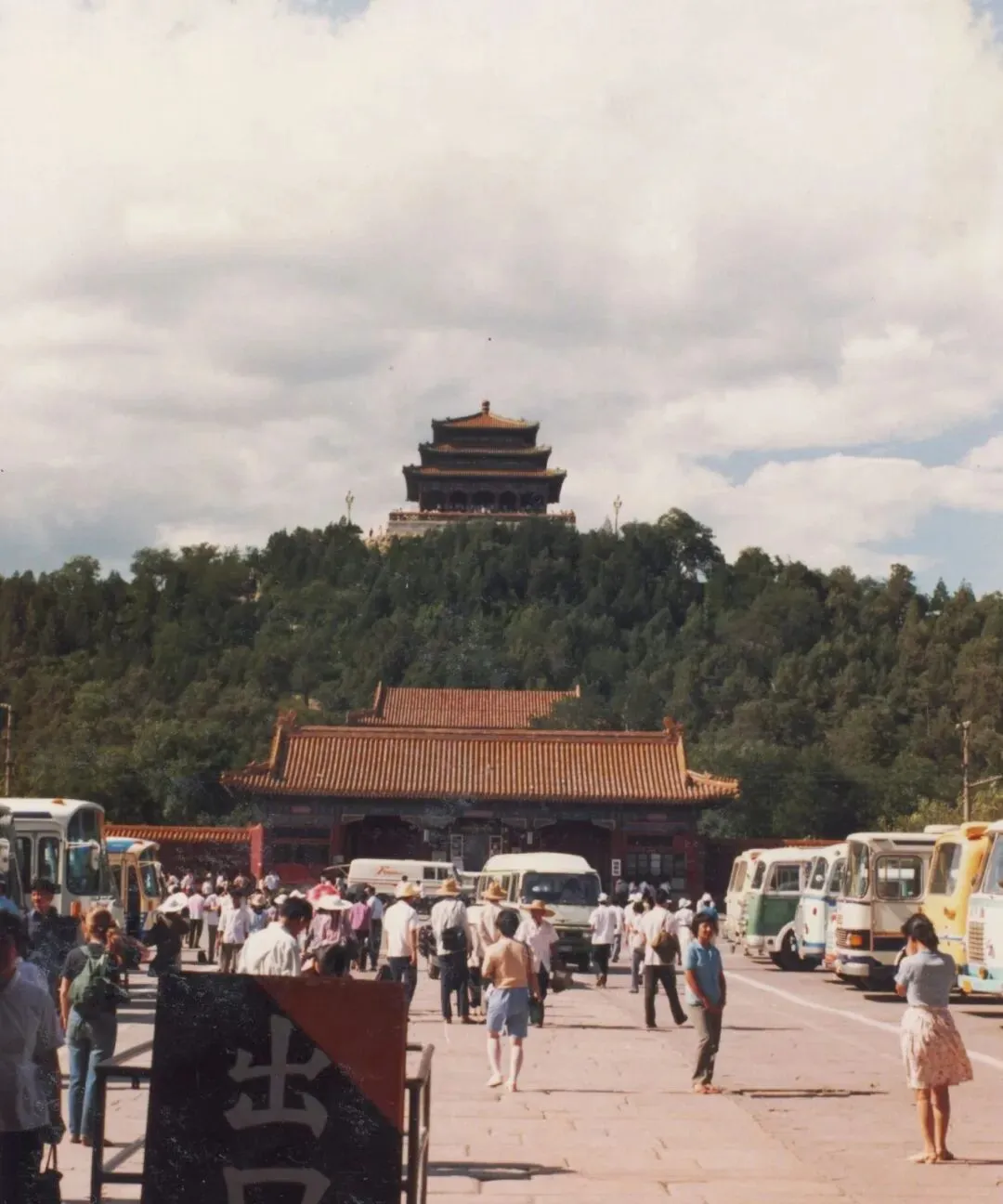 这片空地是景山公园门口的大巴停车场,车身颜色花花绿绿,导游举着小旗在前面招呼,远处的万春亭正对着天光,拍合影时总有人喊一声,看镜头,别眨眼。