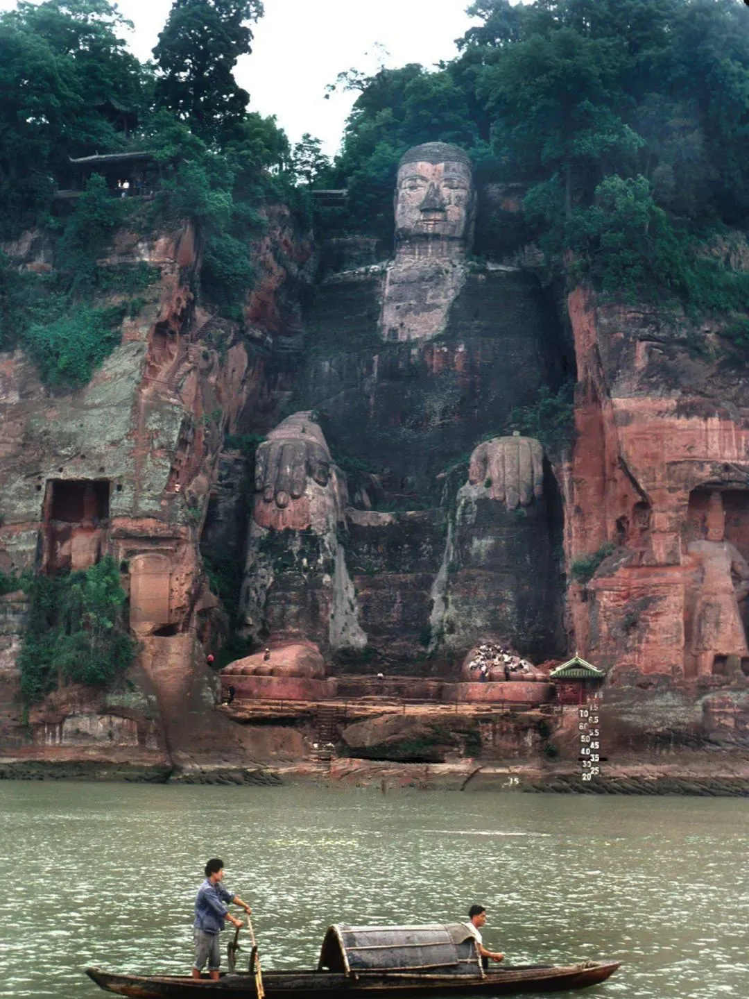 这面岩壁上的坐像是乐山大佛,江水拍在船帮上,船夫一篙点下去,水线在石崖脚下抖成细碎的银边,那时候佛身上青苔多,灰扑扑的,气势却从不打折。