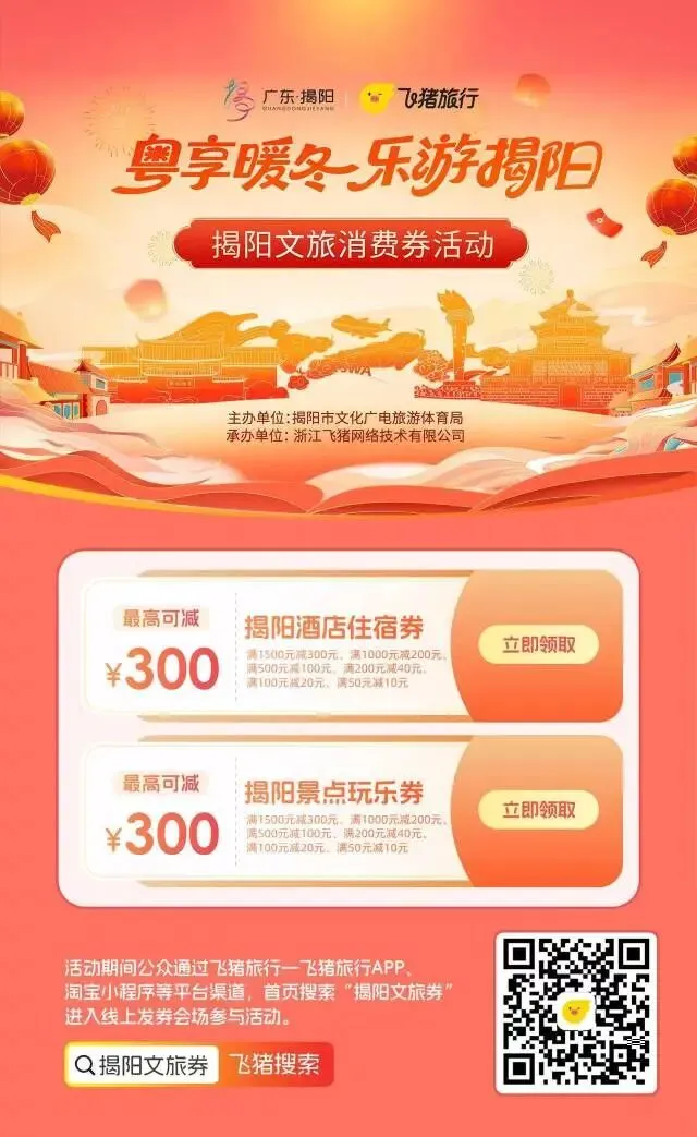 领取方式:公众可通过飞猪旅行APP或小程序(微信、支付宝、淘宝端),在首页搜索“揭阳文旅券”直达活动专题页,也可点击平台政府补贴频道,进入“揭阳文旅券”专区领取。