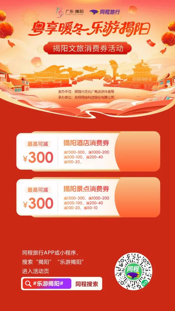 领取方式:公众可登录同程旅行APP或小程序,在首页搜索“揭阳”“乐游揭阳”等关键词直达活动页面,也可通过平台信息流等广告位,进入线上发券页面参与活动、领取消费券。