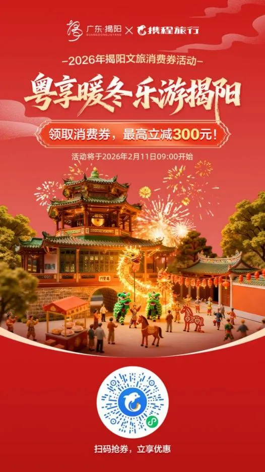 新春将至,年味渐浓。为深入贯彻落实揭阳市委、市政府关于扩大服务消费和促进文旅产业发展的工作部署,扎实推进“粤享暖冬 乐游揭阳”消费季活动落地见效,进一步丰富高品质文旅产品和服务供给,持续释放文旅消费潜力,揭阳市文化广电旅游体育局将于2026年2月11日起,正式启动“粤享暖冬 乐游揭阳”文旅消费券发放活动,以真金白银的补贴,邀八方游客、本地市民共赴千年古城的新春之约。