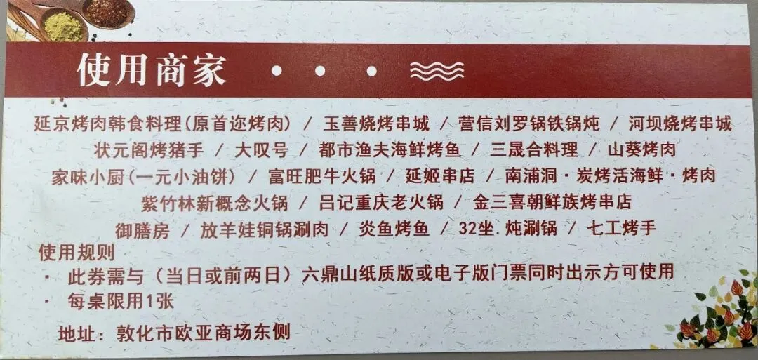 使用商家:延京烤肉韩食料理(原首迩烤肉)/玉善烧烤串城/营信刘罗锅铁锅炖/河坝烧烤串城/状元阁烤猪手/ 大叹号/ 都市渔夫海鲜烤鱼/ 三晟合料理 / 山葵烤肉/家味小厨(一元小油饼)/ 富旺肥牛火锅 / 延姬串店 / 南浦洞炭烤活海鲜烤肉/紫竹林新概念火锅 / 吕记重庆老火锅 / 金三喜朝鲜族烤串店/御膳房 / 放羊娃铜锅涮肉 / 炎鱼烤鱼 / 32坐·炖涮锅 / 七工烤手