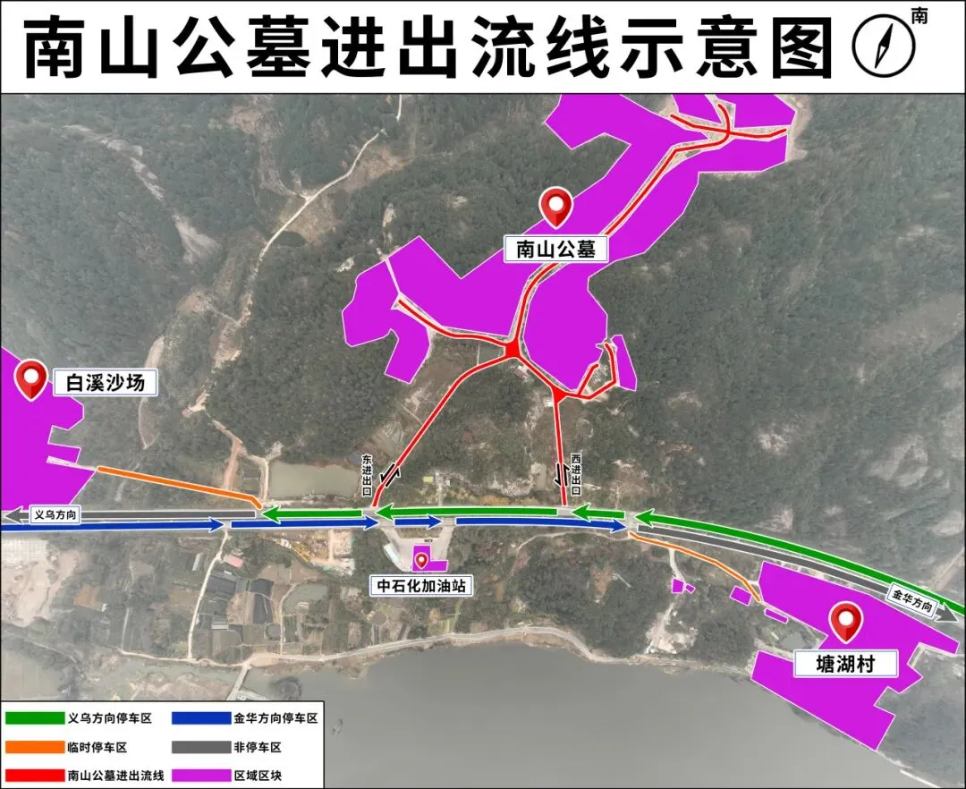 南山公墓地处金义东公路南侧,白溪村以西1000米处。预计大年初一该公墓周边车流量约1.3万辆次、人流量约3.3万人次,高峰时段为11:00-11:30。