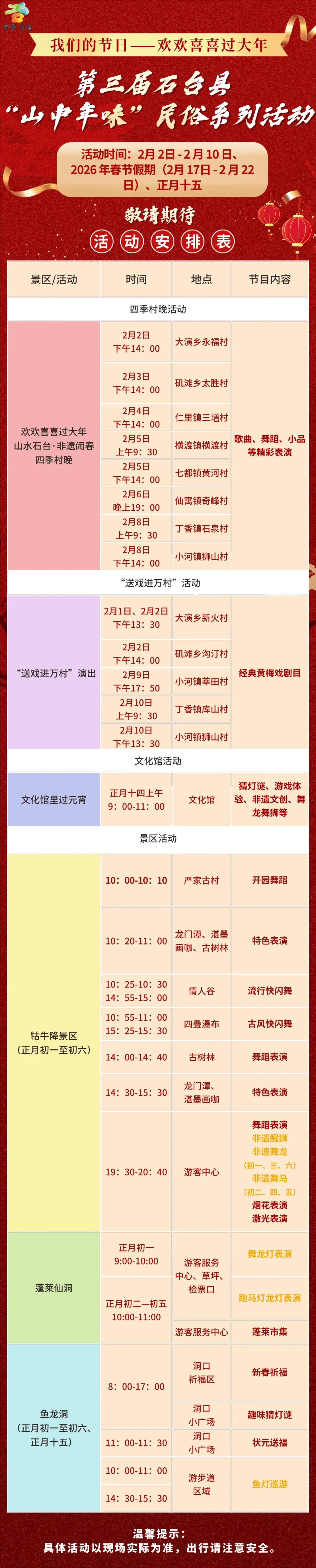 调研中,张勇着重强调,春节期间人流、车流增加,风险隐患增多,各级各部门要以“时时放心不下”的责任感,紧盯旅游安全、民生保障、社会稳定等关键环节,压实责任、细化措施,确保各项工作落实,让全县人民和游客度过平安欢乐祥和的春节。