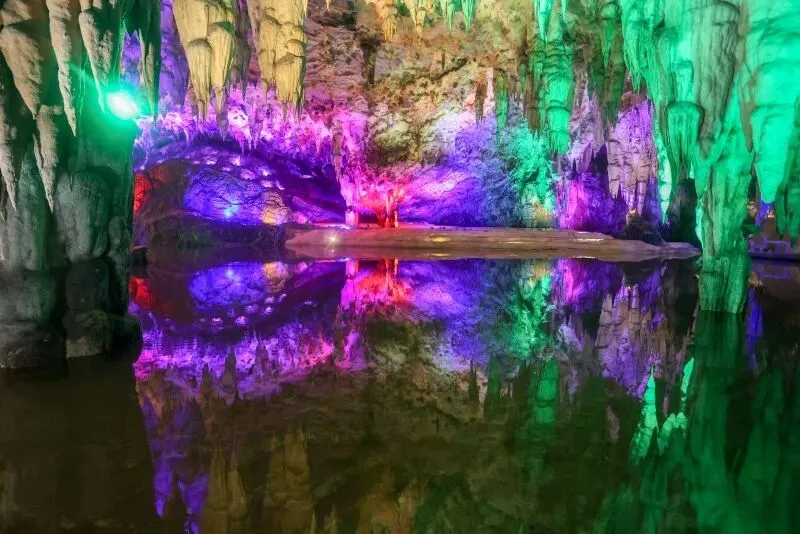 走进罗妹洞,就像是踏入了一座天然的地质博物馆,洞内的钟乳石历经亿万年时光雕琢,有的如同破土而出的竹笋,有的仿佛垂落的冰瀑,在五彩灯光的渲染下,宛如一个光怪陆离的地下魔幻世界。洞内发育的莲花盆数量及规模堪称世界之最,最大直径达9.4米,被称为“莲花盆之王”,排名世界第一。