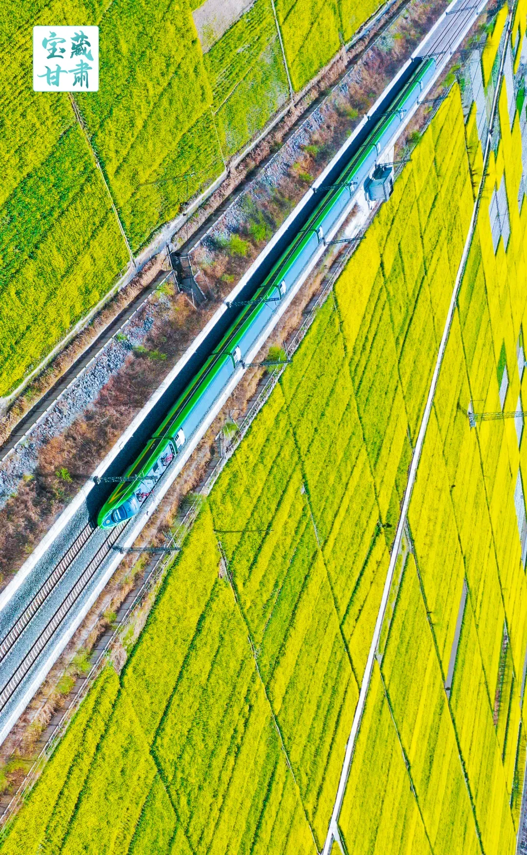 ▲文县乡野已绘色 陈勇 摄 兰渝铁路线上 列车穿梭于金黄色的花海之中 为秦巴山地勾勒出 一幅生机勃勃的春日画卷