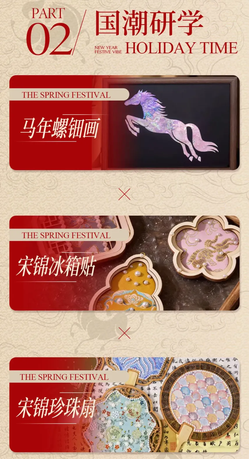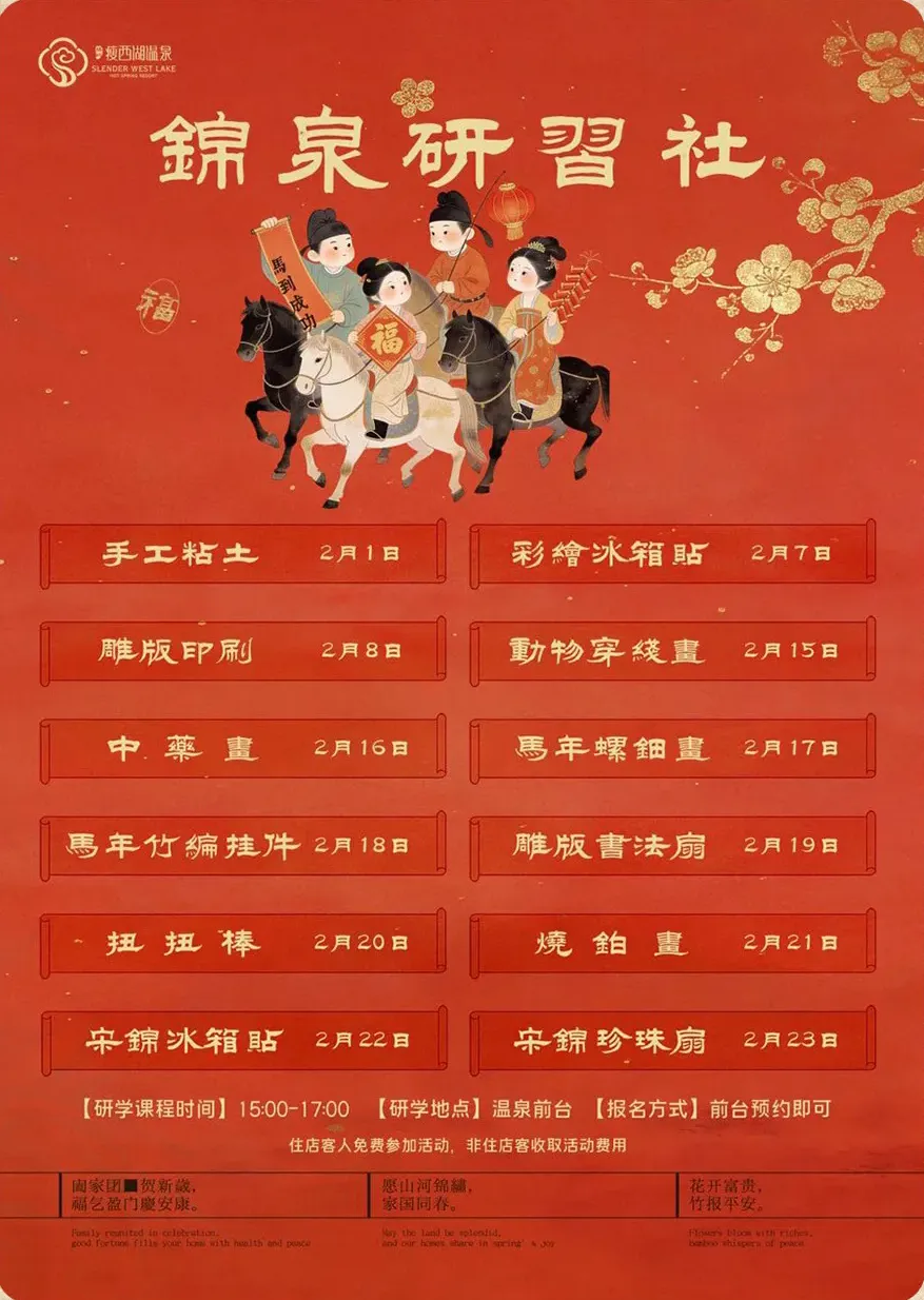 这个春节,文化与年味撞了个满怀,度假村内的锦泉研习社非遗手作活动热闹开启,动物穿线画、中药画、马年螺钿画、马年竹编挂件、雕版书法扇扭扭棒、烧泊画、宋锦冰箱贴、宋锦珍珠扇。大年初一至大年初七(2月17日至2月23日),丰富有趣的非遗体验之旅。