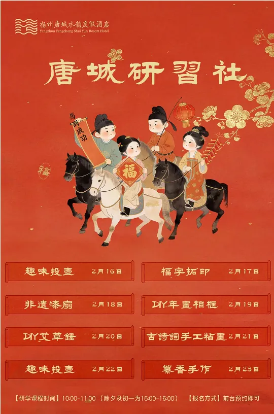 唐城水韵度假酒店诚邀您与家人解锁一站式马年新春盛宴,欢喜过大年非遗手作里,镌刻匠心年味暖汤康养中,舒缓一年疲惫雅致茶歇间,慢品岁月静好美味珍馐宴,共庆阖家团圆。