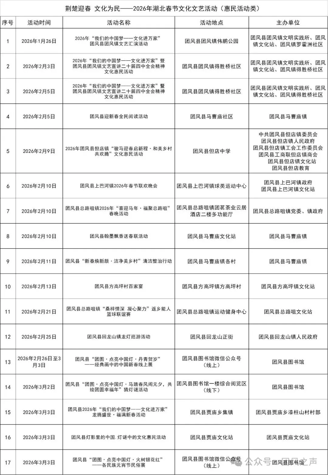 精彩内容:在县图书馆举行“绘青山绿水,谱生态华章——2026黄梅画家画黄梅”美术作品展”。在滨河大道人才书香园,县图书馆、书法家协会为市民免费书写春联。以及线上有奖猜灯谜与民俗答题,同步开展春节习俗线上线下展览,以书香浸润年味。