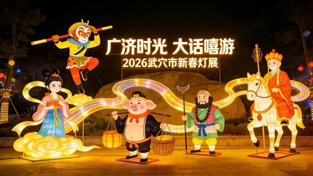 长达约2公里的广济时光景区中轴线上,将布设《西游记》主题大型花灯。无论是大闹天宫的齐天大圣,还是西行取经的师徒四人,都将以璀璨灯影的形式“现身”武穴。夜幕降临,华灯初上,仿佛走进奇幻神话世界,随手一拍都是大片!