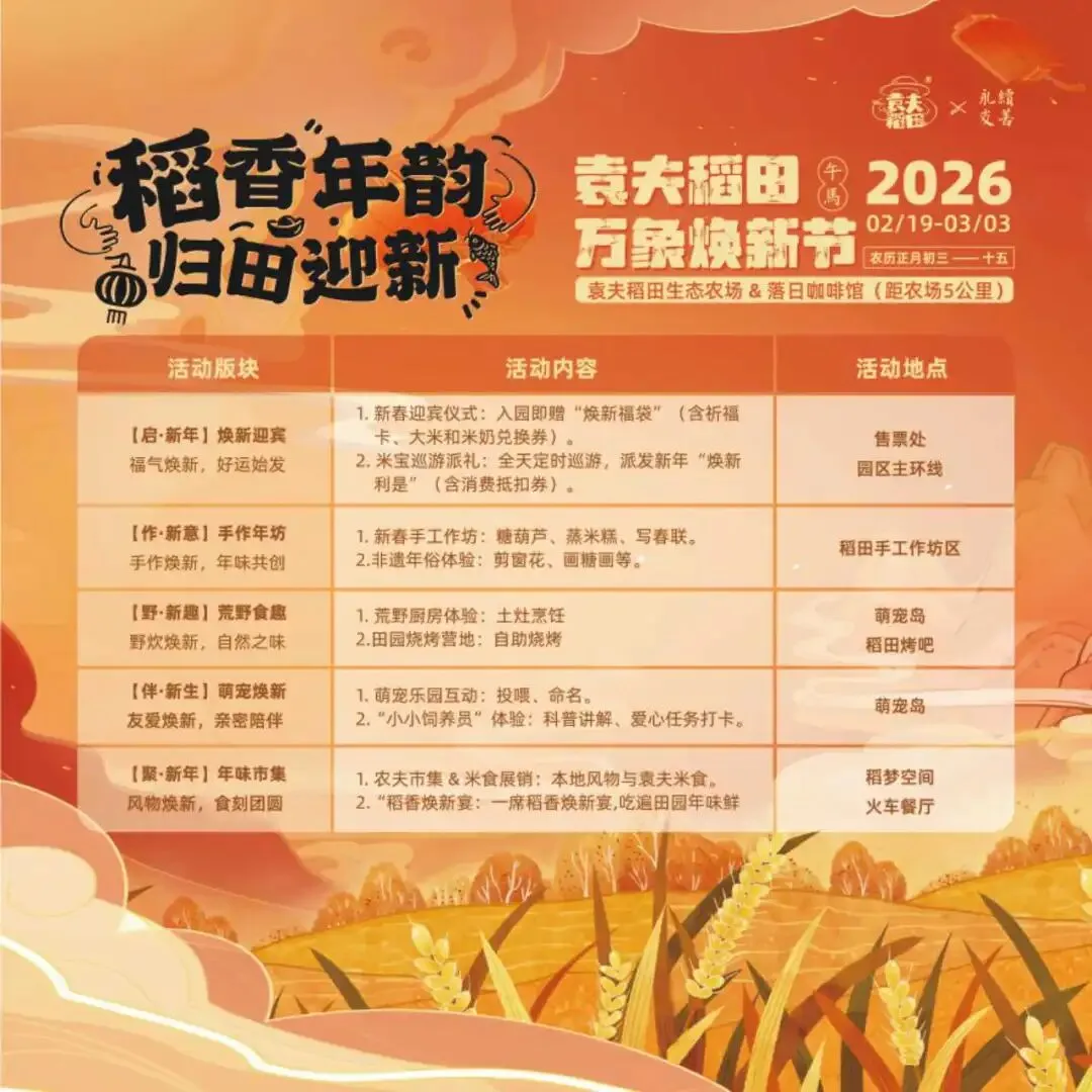 精彩内容:推出新春迎宾仪式、米宝巡游派礼、新春手工作坊、非遗年俗体验、荒野厨房体验、田园烧烤营地、萌宠乐园互动、“小小饲养员”体验、农夫市集、米食展销、“稻香焕新宴”等活动,解锁田园年味新体验。