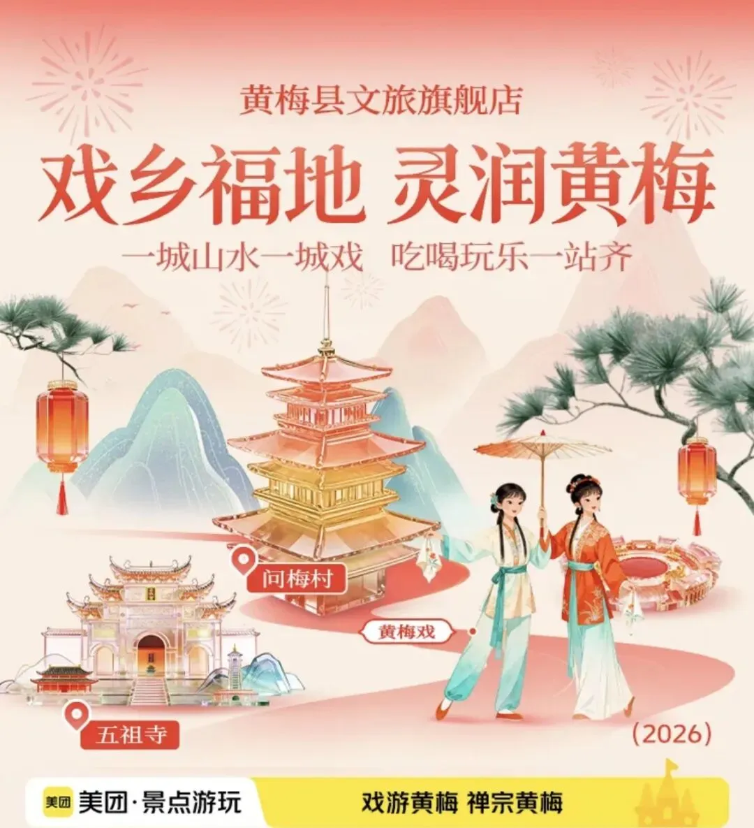 精彩内容:联合美团,焕新推出黄梅县文旅旗舰店,聚焦酒店、景区、度假、交通、餐饮等多维产品矩阵,通过上线百款爆品和优惠福利,为游客打造“轻松玩、深度游、欢乐购”高性价比的黄梅县旅游体验。同步参与2026“知音湖北”新春文旅消费补贴,在商家详情领券栏位点击进入消费补贴专属活动页面,点击领券后,即可进入商品详情页面购买补贴商品。