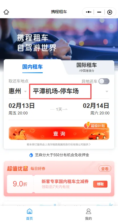 ①微信搜索“携程租车”小程序,注册并登录;