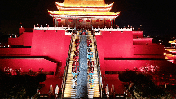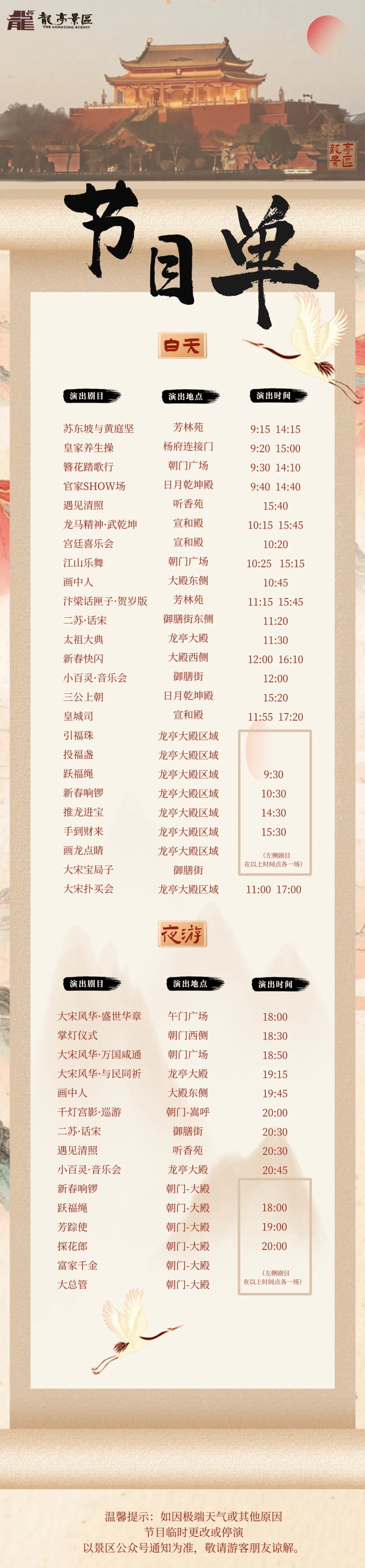 朝门广场《簪花踏歌行》→宣和殿《宫廷喜乐会》→龙亭大殿《太祖大典》→宣和殿《皇城司》→大殿前《小百灵·音乐会》→午门广场《大宋风华·盛世华章》→朝门西侧《掌灯仪式》→龙亭大殿《大宋风华·与民同祈》→朝门-嵩呼《千灯宫影·巡游》
