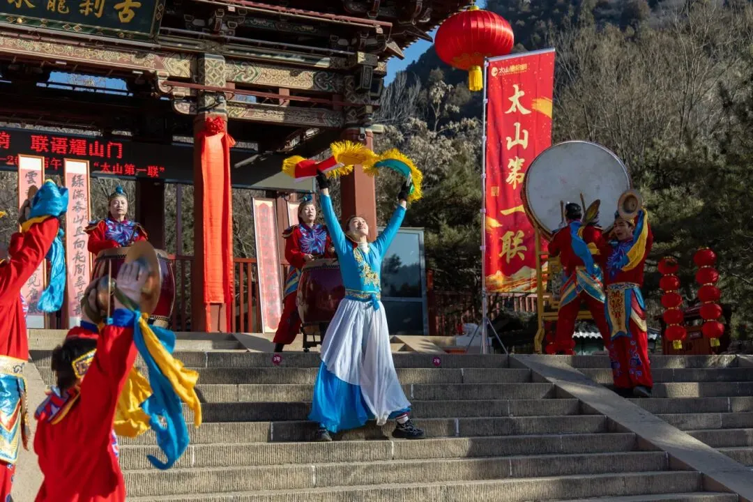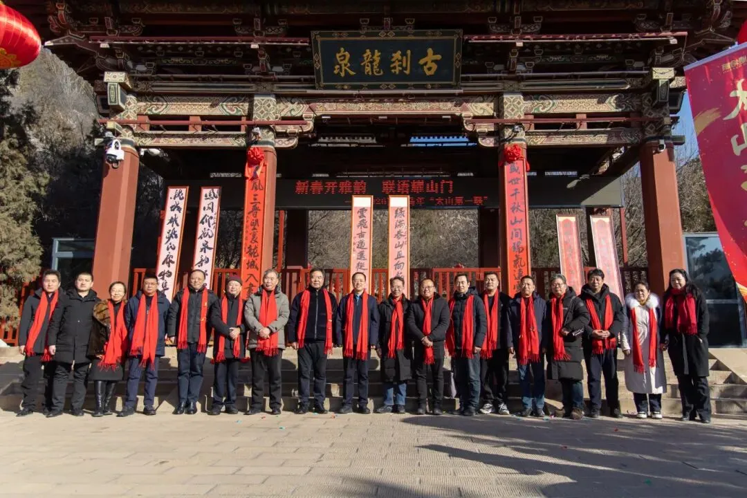 在全场的期待与热烈掌声中,“新春开雅韵 联语耀山门 ——2026丙午马年太山新春第一联” 正式揭幕。红绸轻落,墨宝生辉,这幅笔力遒劲、意蕴悠长的楹联正式亮相山门,为千年古刹增添了浓浓的新春文化气息,也成为太山新春一道亮丽的文化风景线。