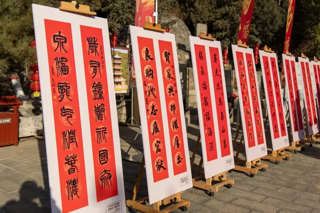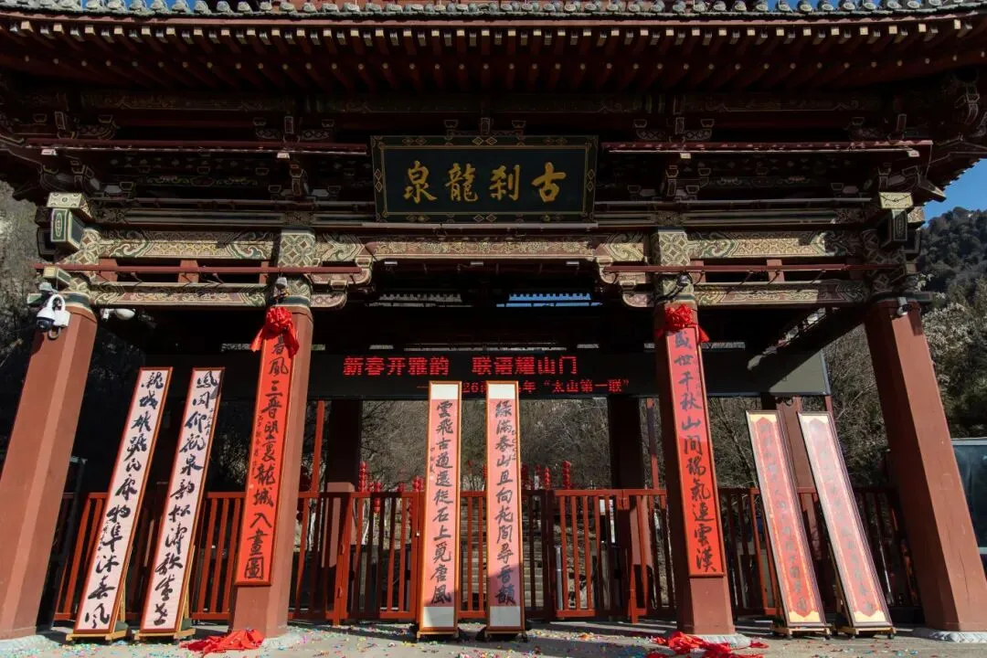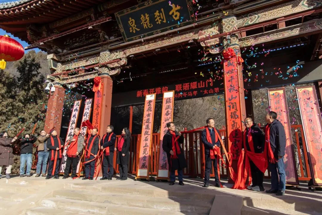 太行麓下,古刹迎春,墨韵飘香。2月13日,由太原市文物局主办、太原市太山博物馆与《对联》杂志社共同承办的“2026丙午马年太山新春第一联”主题展在我馆山门前盛大启幕。