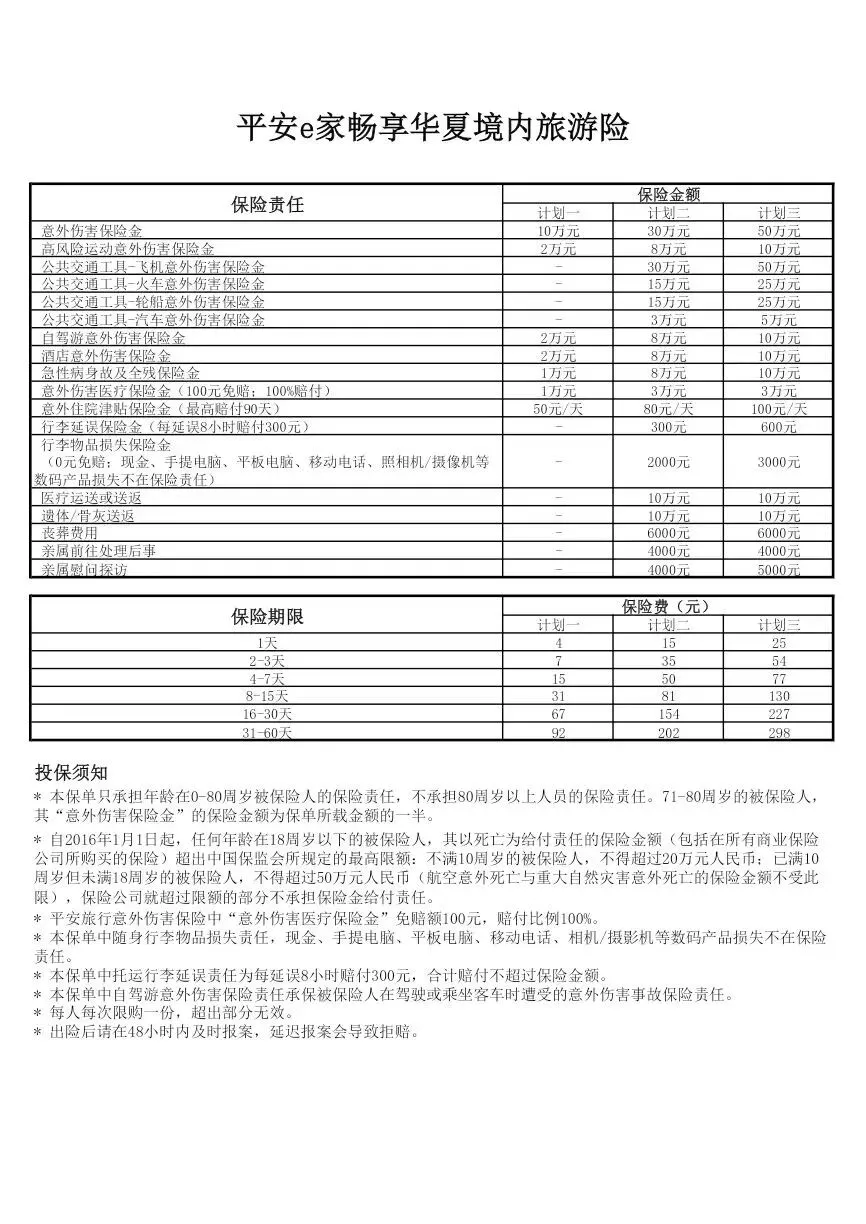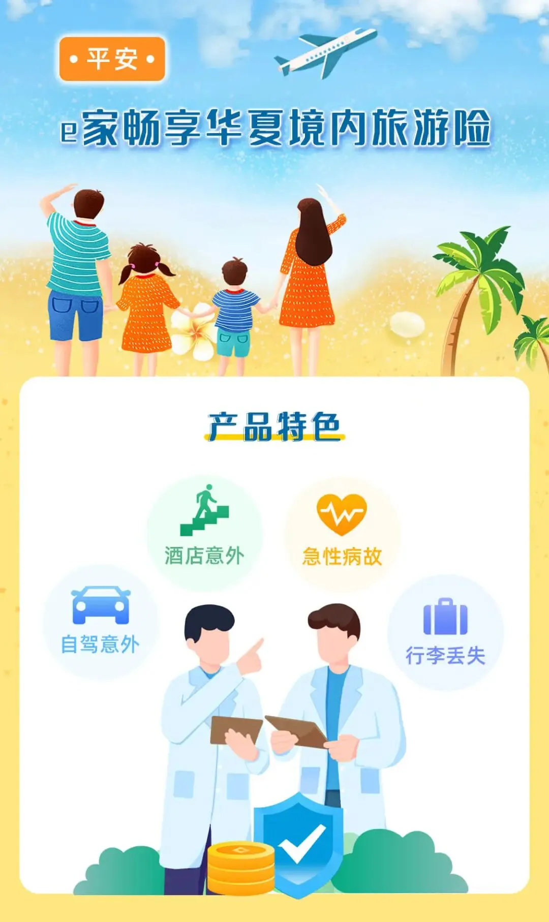 平安e家畅享华夏境内旅游险:1天起保,0-80周岁,保额50万,酒店意外,自驾意外,急性病故,行李丢失等保障.
