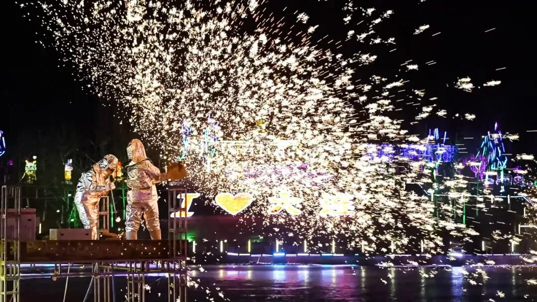 踏入山海奇幻谷,10余组大型主题灯组点亮整个山谷,为游客呈现一幅流动的千年画卷:入口处是《麒麟纳福》灯组,麒麟踏着祥云熠熠生辉;《千里江山》灯组如一卷徐徐展开的立体水墨画;天鹅湖上,《锦映华池》悄然绽放;万花广场上,“财神爷”灯组吸引众多游客竞相打卡;夜幕降临,非遗打铁花在山海奇幻谷璀璨绽放,“飞天大秀”点亮天际......