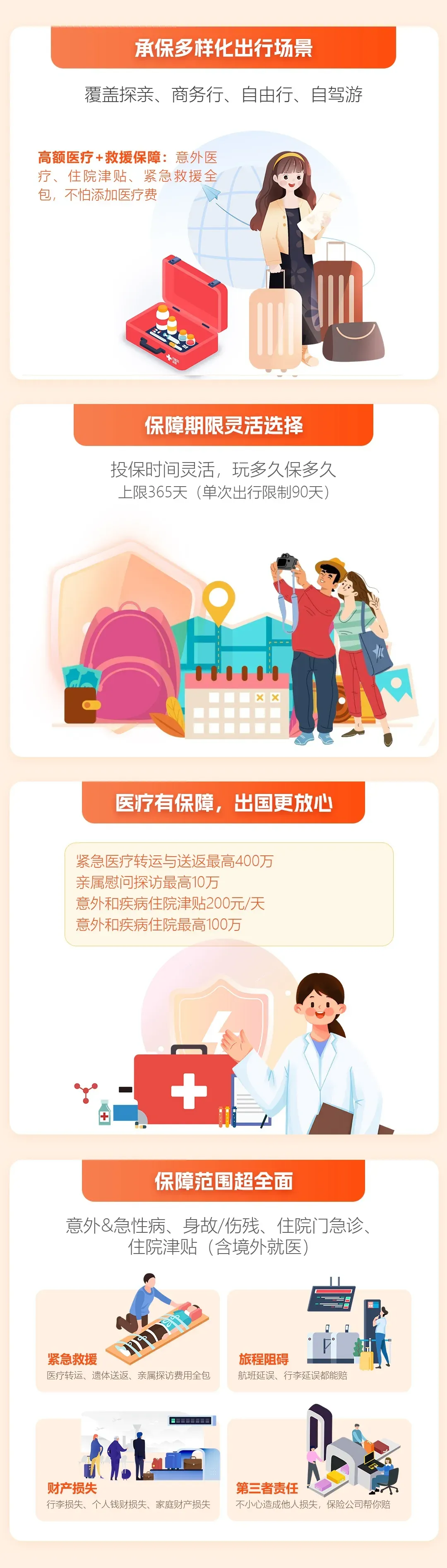0-85岁,全球,个人企业均可投保,可团单,支持身份证/护照/军官证/港澳通行证/回乡证或台脆证,覆盖探亲、商务行、自由行、自驾游,1天起保最长1年单次最长90天,可用于申根签证,涵盖瑞士、德国、法国、意大利等27个申根国,身故保额最高120万,医疗保额最高100万,医疗运返保额最高400万,遗体送返最高200万,覆盖急性病、行李延误、行李损失、个人责任、住院津贴等。