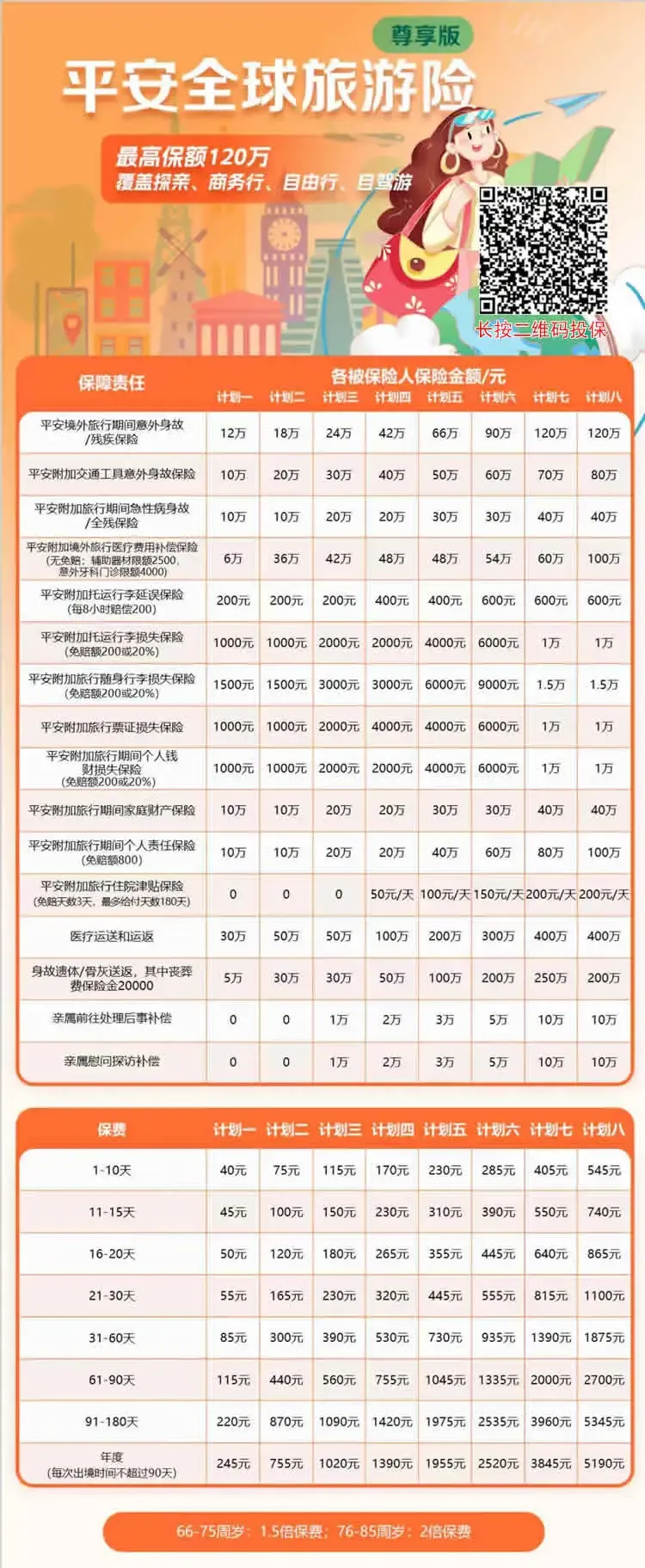 平安全球旅游险(尊享版):个人企业,外籍可投,1天起保最长1年,身故最高120万医疗最高100万,含紧急救援/行李延误/申根签证