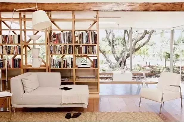 玻璃方盒状的区域是餐厅和厨房,这里视野绝佳,可以看到窗外的花园和摇曳的树木。