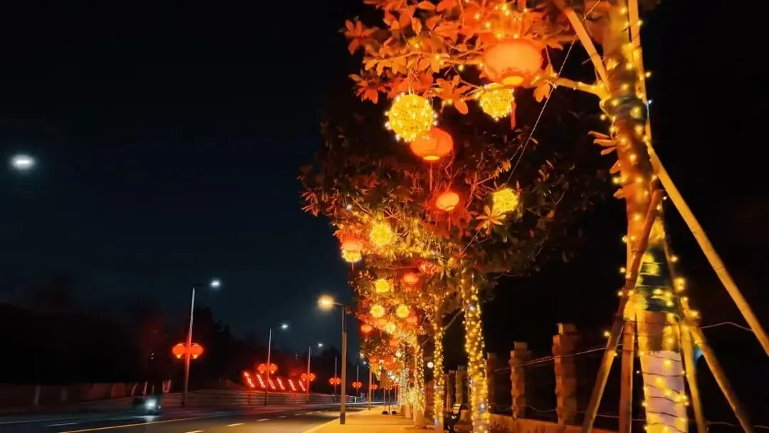 走进花果山景区,年味早已扑面而来,五颜六色的灯笼挂满枝头,在树间摇曳生姿,为景区披上了一袭节日的盛装。待到暮色四合,万千彩灯次第亮起,橙黄的光晕沿着山间步道铺展开去,把整条山路都染得暖融融的。微风吹过,灯笼轻轻摆动,恍若天上星火坠入人间,处处都是团圆的年味。