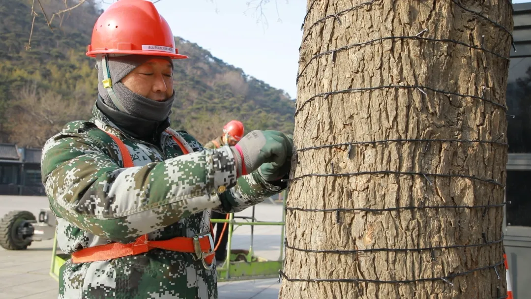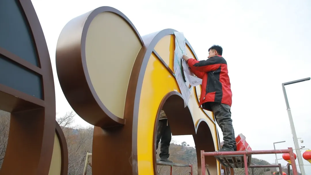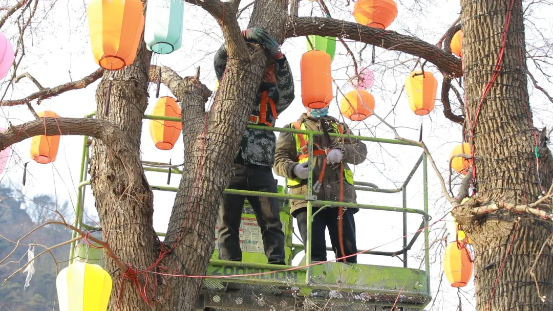 为营造浓厚的春节氛围,景区工作人员不畏严寒、加班加点,登高挂灯、布置打卡点位,指尖忙碌、脚步不停,在寒风中细致摆放每一件装饰,在高处小心悬挂每一盏灯笼,一灯一绸、一字一景,将喜庆与吉祥一点点铺满花果山,用双手为游客编织出满满的新年期盼。张师傅站在升降机上,手指冻得不太听使唤,还是稳稳地把一盏盏灯笼挂上枝头。“过年就要有年味,我们多忙一点,游客一进山,就能感觉到热闹和欢喜。”天气寒凉,景区特意为他们备好了热茶和暖手宝。“天气冷,缠绕灯线不方便戴手套,景区这杯热水真是暖到心坎里”。张师傅大力点赞。