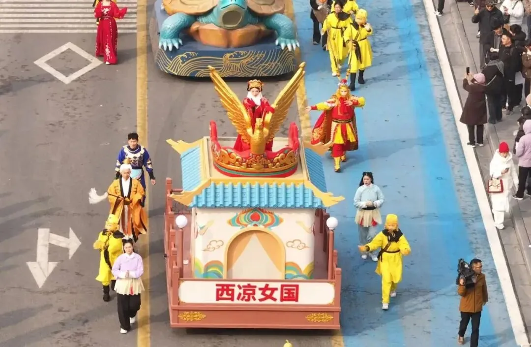 今年春节,花果山还新添了一支“花车”巡游队。在西游特色花车旁,工作人员正弯腰调试花车电机,旁边几个年轻演员正整理衣服,一会儿花车就要试跑。“咱们这车一亮相,得惊艳全场。”不少身穿红马甲的工作人员也忙得热火朝天,几人合力,正沿着游步道拉起一道红色的隔离带,“先彩排一遍,看看路线顺不顺。”领队站在拐角处指挥。“我们要为表演当天做好动线引导,要热闹更要安全。”