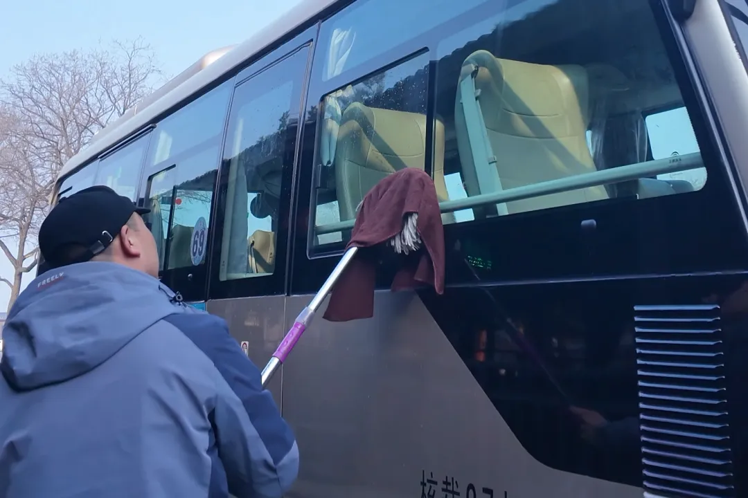 另一头,景交车司机王师傅正俯身查看轮胎气压状态。为应对春节客流高峰,景区景交车驾驶员提前进入备战状态,每日清晨在车辆间来回穿梭,严格检查每辆车的制动、灯光和轮胎。“春节快到了,我们更不能松懈,要让游客安全上下山。”景交车司机王师傅眼神坚定。同样的,作为春节前后最忙碌的工作人员,景交车司机中午没有固定吃饭时间,景区特意将热腾腾的盒饭打包好,送到每位坚守岗位的司机手上,让他们在奔波间隙也能吃上一口暖心的饭。