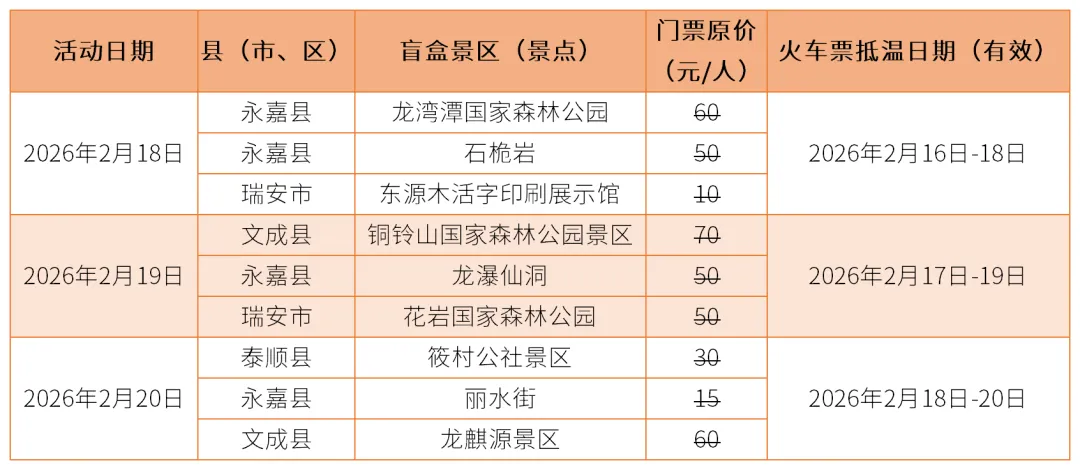 作为“来温州 享温暖”文旅IP的重磅福利,本次推出火车票免费游景区盲盒计划,全市共计30个景区(景点)参与活动!每期解锁未来3天免费景区清单,每日3-4个专属宝藏景点,凭有效火车票即可免首道门票入园,一人一票,把温州的山海风光、人文底蕴打包送给你。