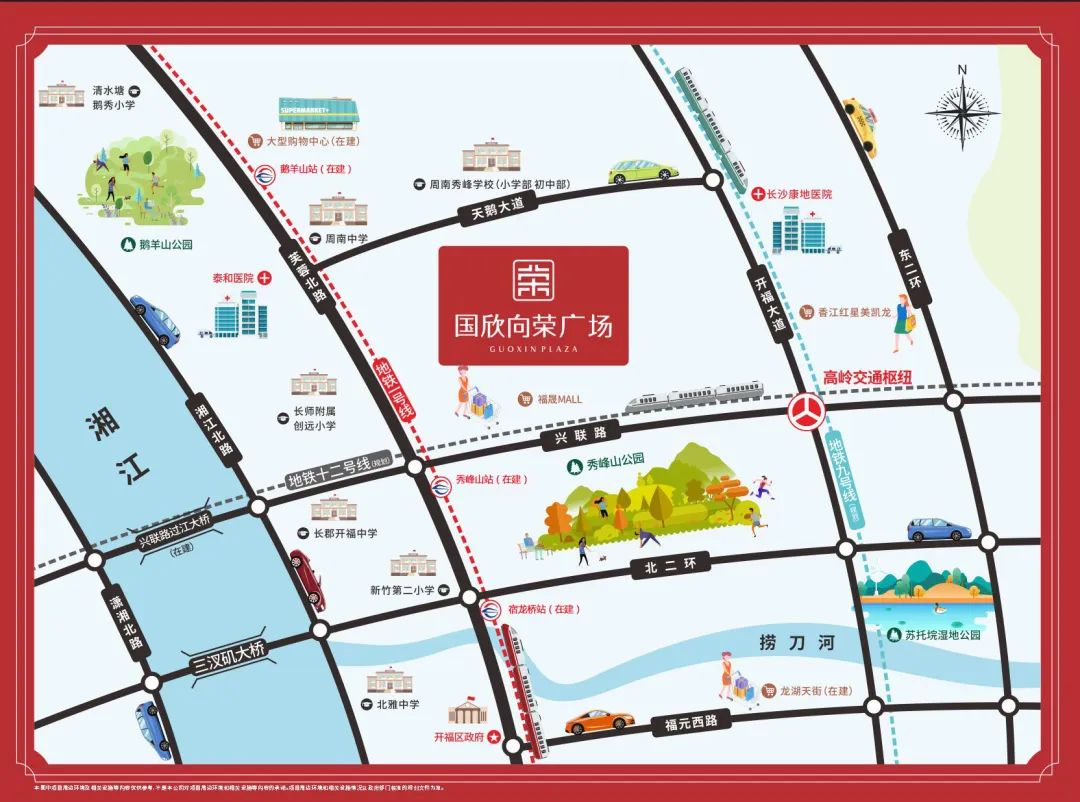 免责声明:本宣传资料属于邀约邀请,交付标准及双方权利义务以买卖双方签订的《商品房买卖合同》为准。关于周边环境、交通/公共设施、商业配套、教育资源、发展/投资前景的介绍仅供参考,因存在开发商无法控制因素,开发商对此不做承诺。本图示仅用于展示项目与周边配套、交通线路的相对位置关系,旨在提供相关信息供参考。具体位置需以官方地图或实际为准。开发商:长沙国欣秀峰房地产开发有限公司。