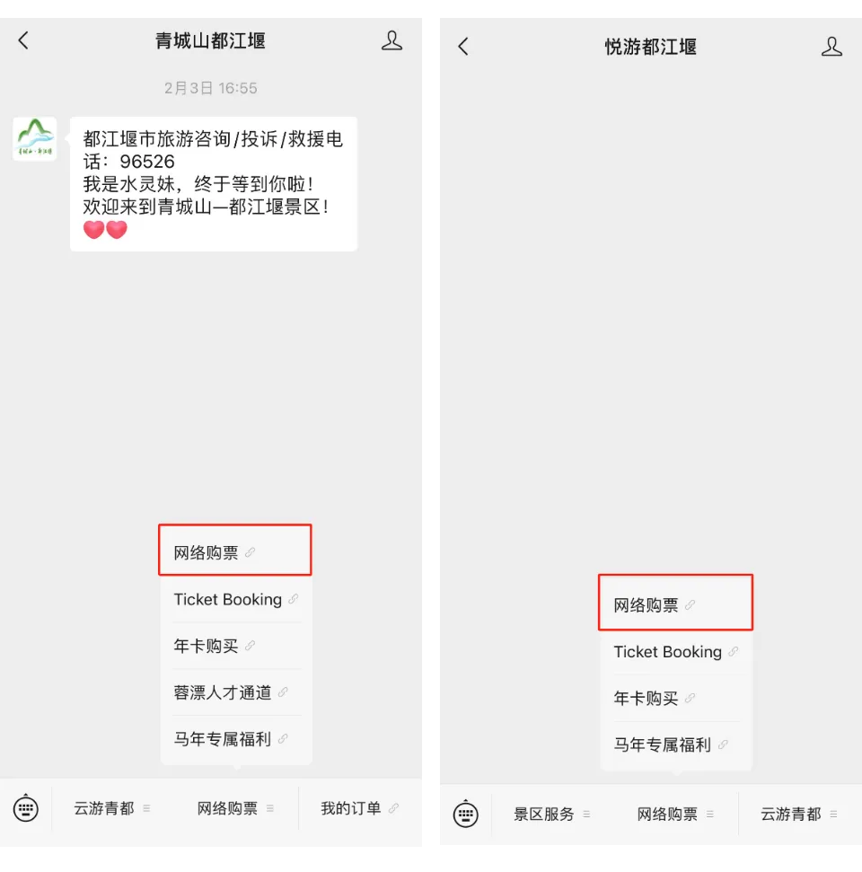 请通过景区官方微信公众号(青城山都江堰、悦游都江堰),或官方授权平台美团、携程等提前预约购票。若您通过非官方公布渠道购买门票,可能会出现无法入园、无法退票等情况,请您谨慎选择购票途径。春节假期客流量高峰,建议前往青城山—都江堰景区的游客朋友提前网络购票。