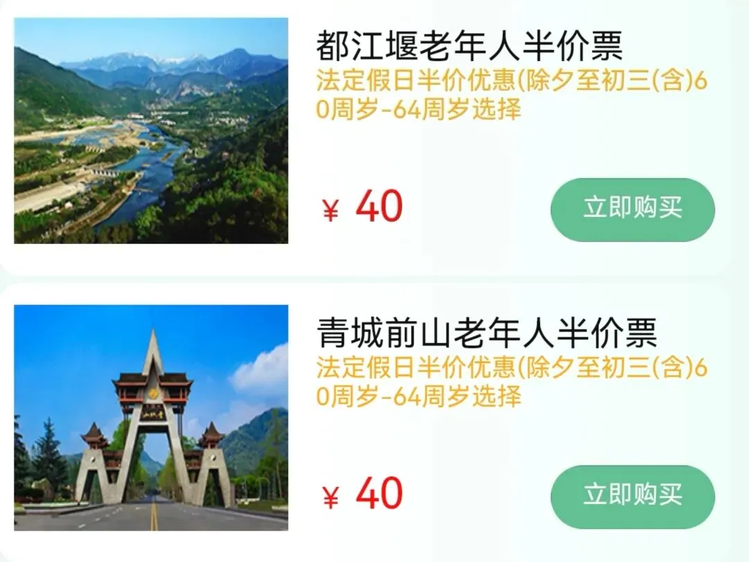 ①老年人减免优惠:春节期间(2月16日至19日)对年满60—64周岁中国籍老年游客,实行门票半价优惠。须在“悦游都江堰”或“青城山都江堰”微信公众号预约购票,刷本人身份证入园。非国家法定节假日时间刷本人身份证免票、免预约入园。