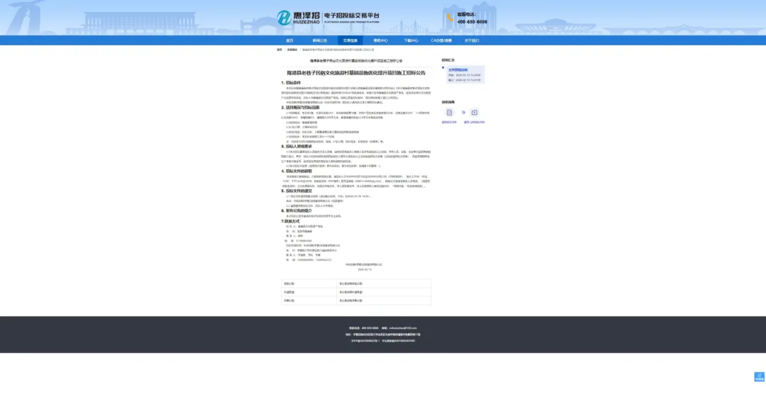 1. 招标条件 本招标项目隆德县老巷子民俗文化旅游村基础设施优化提升项目已由隆德县发展改革和科学技术局以《关于隆德县老巷子民俗文化旅游村基础设施优化提升项目初步设计的批复》,隆发科审(2026)47号批准建设,项目业主为隆德县文化旅游广电局,建设资金来自文化旅游产业发展专项资金,招标人为隆德县文化旅游广电局。项目已具备招标条件,现对该项目施工进行公开招标。 中瑞恒邦(宁夏)项目管理有限公司(招标代理机构)受招标人委托负责本工程的招标事宜。 2. 项目概况与招标范围 2.1项目概况:电子屏1套、木质垃圾箱50个、休闲桌椅板凳10套、农特产品售卖区货架安装220米、招牌及旗子28个、1-8号院中式灯笼更换160个、砖雕院牌8个、道路提升200平方米、瞭望塔墙体彩绘52.8平方米等建设内容 2.2建设地点:隆德县城关镇 2.3计划工期:工期90日历天 2.4招标范围:招标文件、工程量清单及施工图纸范围内的全部内容 2.5标段划分:本招标项目施工共计一个标段 注:说明本次招标项目的建设地点、规模、计划工期、招标范围、标段划分(如果有)等。 3. 投标人资格要求 3.1本次招标要求投标人具备独立法人资格,且同时具有建筑工程施工总承包叁级及以上资质,并在人员、设备、资金等方面具有相应的施工能力,其中,投标人拟派项目经理须具备建筑工程专业贰级及以上注册建造师执业资格(注册建造师执业资格),具备有效的安全生产考核合格证书,且未担任其他在施建设工程项目的项目经理。 3.2本次招标不接受(接受或不接受)联合体投标。联合体投标的,应满足下列要求:/。 4. 招标文件的获取 本项目实行邮箱报名。凡有意参加投标者,请投标人于2026年02月13日至2026年02月27日(节假日除外),每天上午08:00至12:00,下午14:30至18:00,将报名资料(PDF格式)提交至邮箱(604157264@qq.com),邮箱正文请填写联系人及电话。(须提交的报名资料:营业执照复印件、资质证书复印件、法人授权委托书、法人及被授权人身份证复印件、“信用中国 ”网站查询报告)。 5. 投标文件的递交 5.1 投标文件递交的截止时间(投标截止时间,下同)为2026-03-06 14:30 。 地点:中瑞恒邦(宁夏)项目管理有限公司(纸质递交) 5.2 逾期递交的投标文件,招标人不予受理。 6. 发布公告的媒介 本次招标公告在惠泽招电子招投标交易平台上发布。 7.联系方式 招 标 人:隆德县文化旅游广电局 地 址:固原市隆德县 联 系 人:韩东 电 话:17789685060 招标代理机构:中瑞恒邦(宁夏)项目管理有限公司 地 址:宁夏银川市兴庆区银川国际贸易中心 联 系 人:李国栋、马虹、李媛 电 话:15008606993、13209543727 中瑞恒邦(宁夏)项目管理有限公司 2026-02-13 隆德县汽车站2026年春节发车公告 关于网友反映隆德县一老旧小区改造后家中漏水问题的答复 隆德农商银行2026年春节期间各网点营业时间公告 隆德县文化馆春节假期闭馆公告