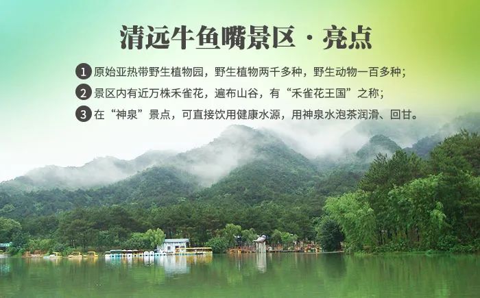 牛鱼嘴景区,一次绿色芬芳的生态之旅景区位于清远市市区东北约10公里处的大帽山,每年3月到4月,牛鱼嘴会有野生禾雀花绽放,一派漫山遍野的姹紫嫣红,游人循道曲径通幽时,便可看到一串串展翅欲飞的“禾雀”的绚烂姿态。牛鱼嘴风景区分为“岭南第一溪”和“牛鱼湖”两大主线,“岭南第一溪”可以使人充分欣赏到来自生态环境的奇花异草、奇峰异石、古藤老树、以及纵横交错的潺潺溪流;“牛鱼湖”则侧重于休闲娱乐和游人的户外素质拓展,设有游泳场、滑草场、烧烤场都多处园地,满足游人的不同需求。